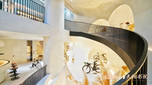 进入天樾书院的那一刻,简约灵动的线条错综交叠,素洁中不失雅韵格调;眼前一道弧形走廊绵延婉转,向前延展而去,仿若下一刻便会有一位曼妙女子从此处款款走过,人去留香,久久不忘...不禁令亮哥浮想起由西班牙建筑师安东尼奥·高迪所建造的米拉之家,可谓是建筑史上的奇迹。弧线呈现细节,尊崇自然理念,正如在天樾书院的旋转梯下驻足仰望,目光所至之处,少了些人工造作,多了几分自然气息。